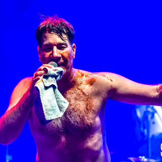 GUTTERMOUTH is a band that just not give a f#ck, they intend to shock, offend and cause controversy, and that's what they did. The band has lots to say about the world, with rants and comedic antics between songs - this was by far the most entertaining band of the night. During the middle of the set lead singer Mark Adkins jumped off the stage and jumped into the crowd, working his way to the side and up on the bowling lanes that were to the left of the stage. while He grabbed a bottle of ketchup and headed back to the stage where he proceeded to squirt the entire bottle all over himself, and then looking like a bloody mess someone tossed him a bottle of mustard and he emptied that all over himself too, on his head, chest, face... and in his shorts. All while the band continued playing song after song. The Brooklyn Bowl staff had to come out with a bucket and mop and try to clean up the stage before headliner took to the stage.