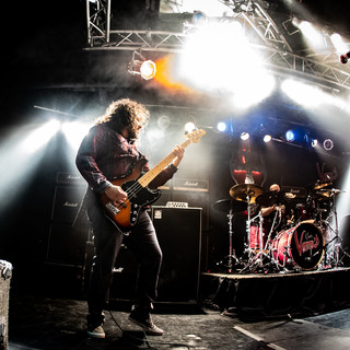 They kicked off their set with the title-track of their second album, Burn The Serum (2014), and the empty floor in front of the stage filled up quickly. They kept on jamming,with barely a breather between songs, rolling right into the title-track of their debut album, Trampled Sun (2011). Their hard-rocking continued until they took a short break to call up Hellyeah guitarist Christian Brady, and give a shout-out to the late Vinnie Paul. Once Brady was set up to play, Kyng kicked off a hard-hitting drum solo that any rock fan would immediately recognize as the beginning of Van Halen's classic, 'Hot For Teacher". They absolutely kill this cover, with Veliz handling vocals, Castaneda filling in all of the David Lee Roth speaking parts between jams, and Brady shredding the Eddie Van Halen guitar riffs. It was a truly memorable moment in an evening filled with great music, and they followed up this brilliant cover with their highest charting single, "Electric Halo". It wasn't on their original set list, but was shouted out by an audience member while Veliz was re-tuning his guitar, so they obviously decided to give the fan what he wanted. They then picked up where they left off with "Trails in Veins", followed by one of my favorites, "I Don't Believe". Before wrapping up with "Falling Down" they did one more cover, this time it was a Black Sabbath classic, "Sabbath Bloody Sabbath", which fit in perfectly with their own music, both in style and sound. Kyng is a phenomenal example of the trend toward the early heavy metal sound of modern stoner rock/metal. If you are a fan of Black Sabbath I believe you will love these guys. I sure do!