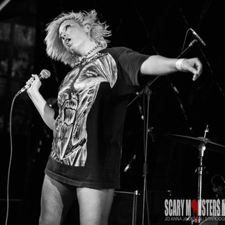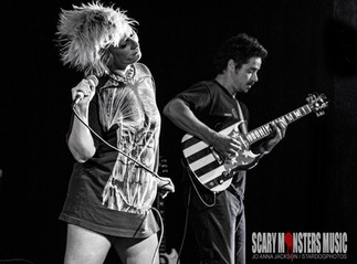 Frontwoman Jemina Pearl is a dynamic force, kicking and flailing across the stage in a TShirt and fishnets and not much more, as she belts out "Thresher's Flail" from their debut, with guitarist Jonas Stein ripping through the chorus, bassist Nathan Vasquez hair swinging